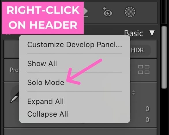 Instead of having all the Basic, Tone Curve, HSL, Detail, etc., panels open at once, Solo Mode keeps just one expanded at a time.